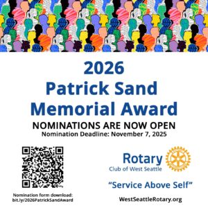 We are now accepting nominations for the 2026 Patrick Sand Memorial Award, honoring the co-founder of the West Seattle Blog, who passed away in October 2024. Help us identify individuals who always show up for the West Seattle community, as Patrick did. Anyone can nominate a candidate for the award by providing a description, with examples, of the nominee's commitment to serving and supporting the West Seattle community and describing how that person has made a difference to the community. Download a nomination form and instructions at bit.ly/2026PatrickSandAward. Nominations should be submitted by e-mail (ws_rotary@yahoo.com) on or before November 7, 2025.