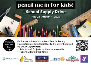 The 2025 school supply drive started July 21 and runs until August 1. Items most in need are folders with pockets (e.g., Pee-Chees), glue sticks, pens and pencils, pink erasers, washable fine tip color markers, washable fine and slant-tip black markers, and wide-ruled paper. Drop off sites include Brookdale Arbor Heights Senior Living, Fauntleroy Church, Fauntleroy YMCA, Potter Construction, and Thriftway. Donations can also be dropped off at Rotary Club meetings (Tuesdays 12 noon at the West Seattle Golf Course clubhouse).